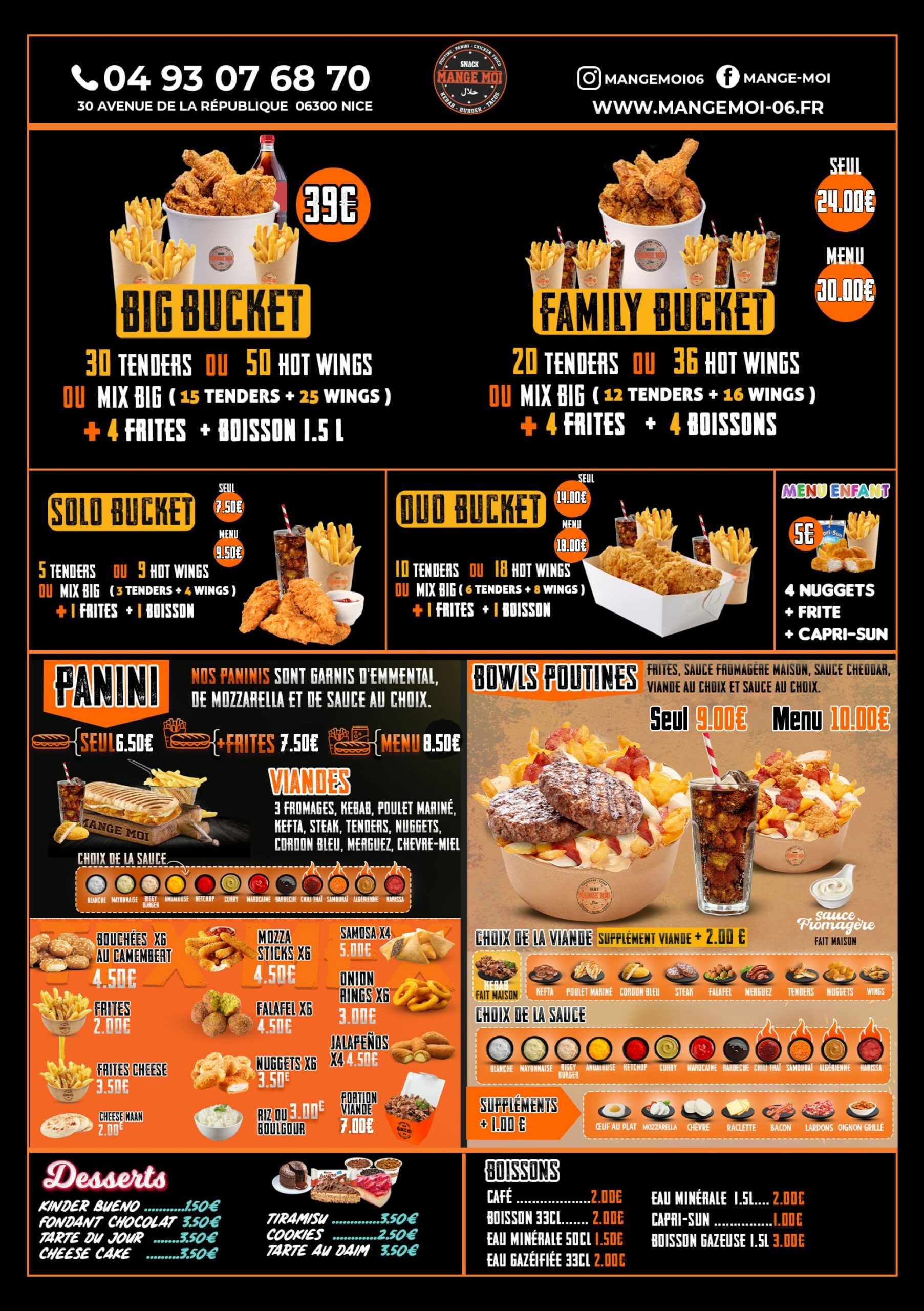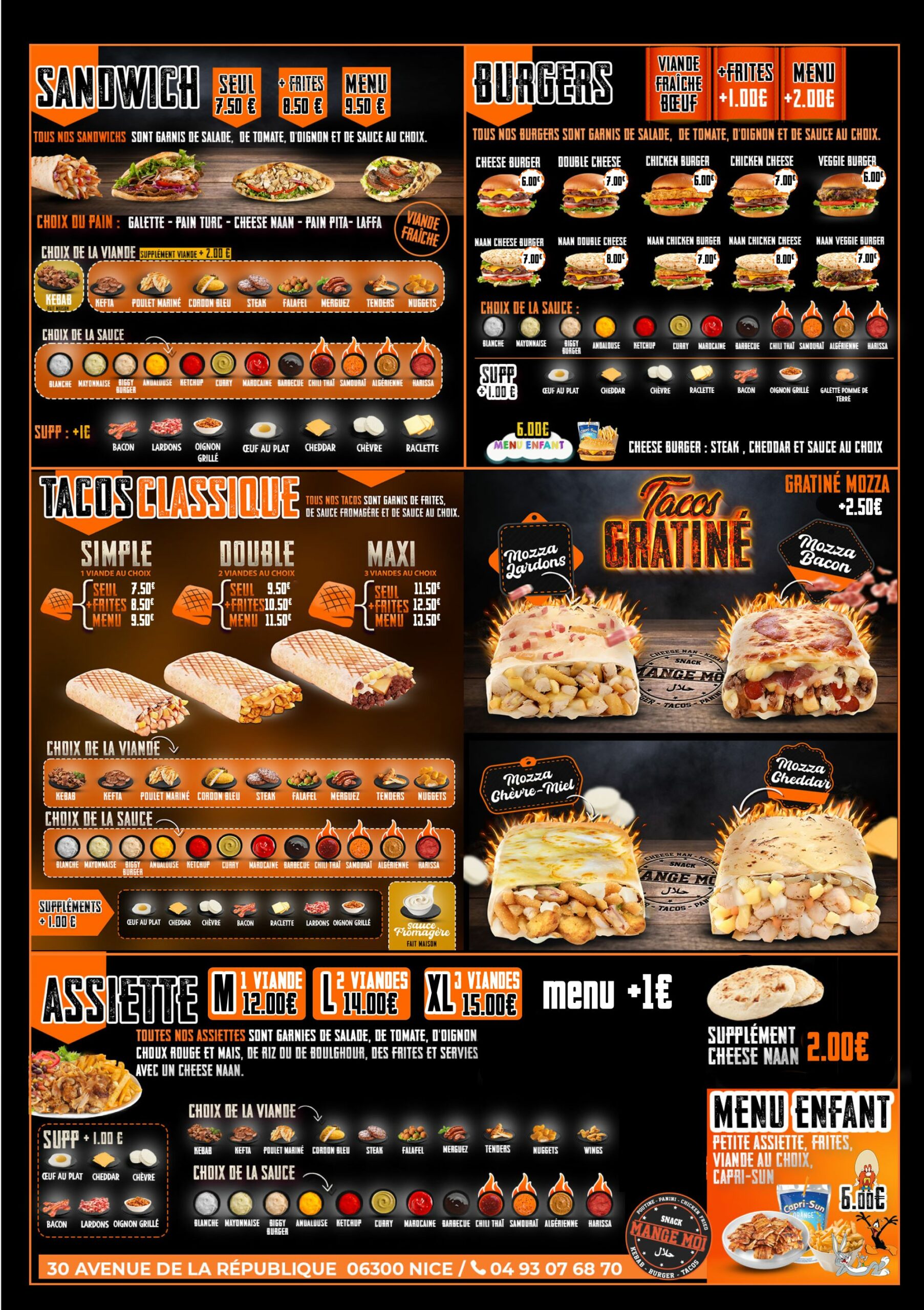 Chez Mange Moi, nous vous proposons une carte variée qui réunit le meilleur du fast-food à Nice. Burgers savoureux, wraps généreux, frites croustillantes et boissons fraîches… tout est préparé avec des ingrédients de qualité pour satisfaire toutes vos envies. Sur place, à emporter ou en livraison, notre menu est pensé pour vous offrir une expérience rapide, délicieuse et conviviale.